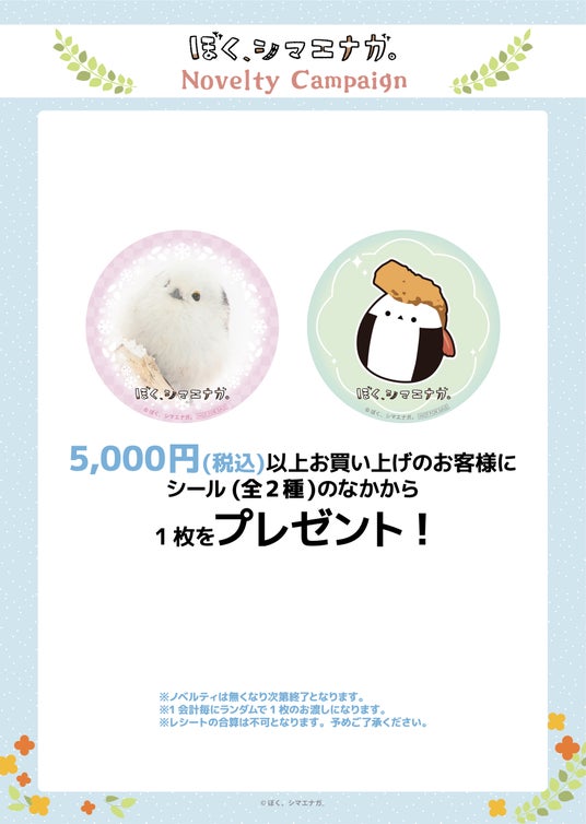 『ぼく、シマエナガ。POP-UP SHOP』では、1会計毎に5,000円(税込)以上お買い上げのお客様に、シール(全2種)を1枚プレゼントいたします。