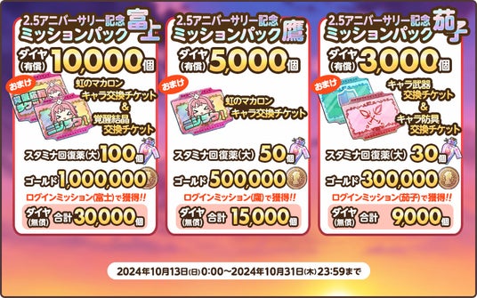 2024年10月13日(日)0:00より、【2.5アニバーサリー記念ミッションパック】の販売を開始致しました。お1人様それぞれ1つまで、「アイテムショップ」の「特別ミッション」タブからご購入いただけます。