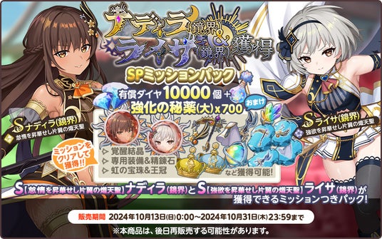 2024年10月13日(日)0:00より「Sナディラ(鏡界)【怠惰を昇華せし片翼の熾天聖】」と「Sライサ(鏡界)【強欲を昇華せし片翼の熾天聖】」が獲得できるスペシャルミッションパックをの販売を開始致しました。お1人様1回まで、「アイテムショップ」の「特別ミッション」からご購入いただけます。