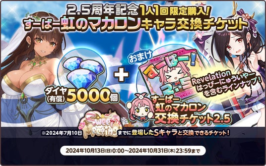 【Revelation】や【はっぴぃにゅういやー!】を含む2024年7月10日までに登場したキャラクターと交換が可能な【すーぱー虹のマカロンキャラ交換チケット2.5×1】と有償ダイヤ×5,000のパックです。