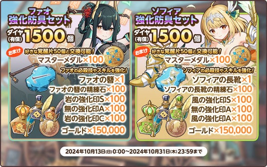 2024年10月13日(日)0:00よりソフィア強化防具セット/ファオ強化防具セットの販売を開始致しました。