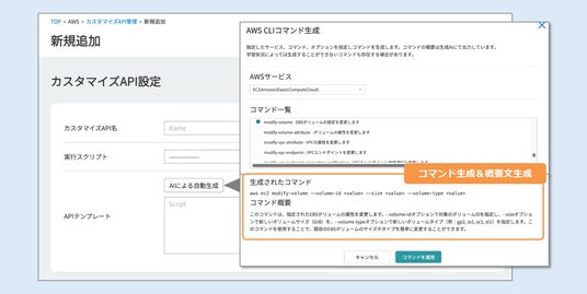 これにより、「マネージドクラウドポータル」からAWSのAPIを介した機能実行においてコマンドの検索と記述に掛かる時間を短縮し、これまでコマンドによるAPI実行を敬遠していたユーザーでも簡単に利用することができるようになります。
