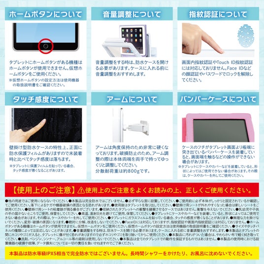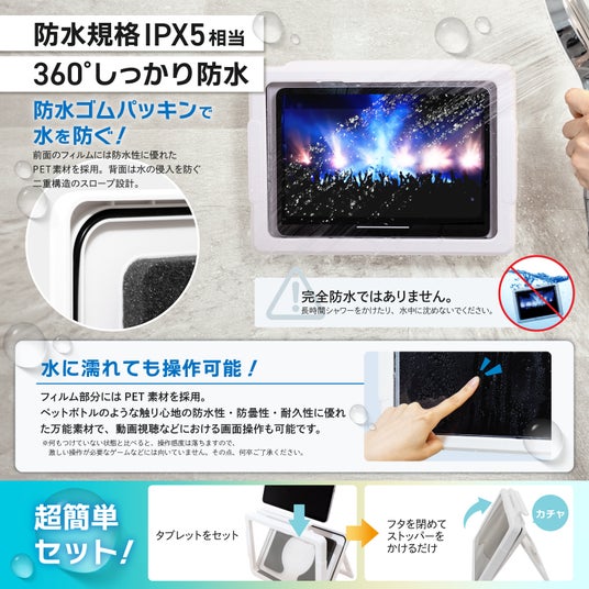 『タブレット防水君』は、防水規格IPX5に準拠しており、お風呂の中でも安心してご使用いただけます。前面フィルムには耐水性に優れたPET素材を採用し、背面は二重構造で水の侵入を防ぎます。また、タッチ操作にも対応しているため、映画や動画、音楽を楽しみながらリラックスしたお風呂時間を提供します。