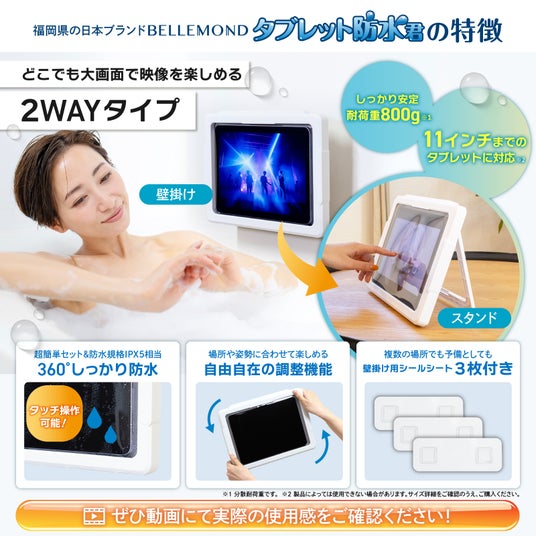 iPadなどのタブレット(最大約11インチ)でのミュージックビデオや読書がお風呂で楽しめる防水ケースが、ガジェットアクセサリブランドのベルモンドから新発売!360度回転するので縦の動画も楽しめます!