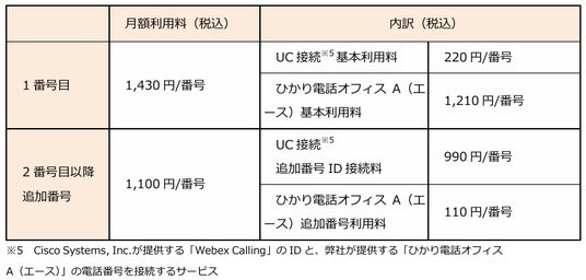 「ひかりクラウド電話 for Webex Calling」 月額利用料