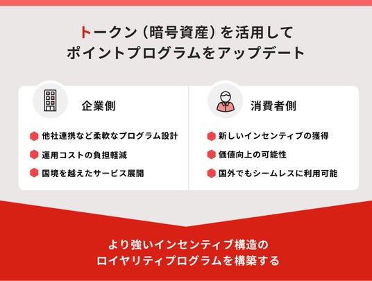 企業側にとっては他社との連携など、今まで以上に柔軟なプログラム設計が可能になるとともに、運用コストの負担軽減が期待できます。一方、消費者側はトークンやNFTを活用した新しいインセンティブを獲得することができ、さらには長期保有によって価値が上昇する可能性も生まれます。また、国境を越えたサービス展開やインバウンド観光客へのアプローチも容易になると考えられます。