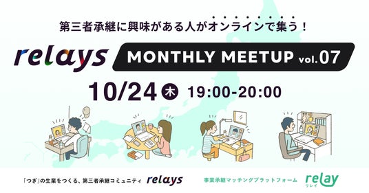 【オンライン交流会】第三者承継コミュニティ「relays(リレイズ)」、事業承継について気軽に話せるイベント「relays MONTHLY MEETUP vol.7」開催決定!10月24日(木)開催。