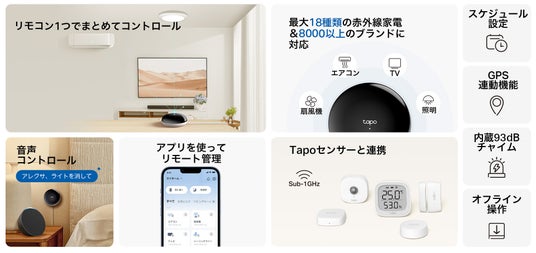 「Tapo H110」は、家庭内の家電を一つのリモコンで操作できるオールインワンのスマートリモコンです。赤外線リモコン対応の家電を1台でまとめて管理でき、複数のリモコンを持つ手間を解消します。さらに、18種類のデバイスタイプと8,000以上のブランドに対応しており、古い家電もスムーズに操作可能です。デバイス互換性のデータベースは3ヶ月ごとに更新されるため、最新の機器への対応も確保されています。「Tapo H110」は、音声コントロール機能があり、Siri、Alexa、Googleアシスタントを利用してハンズフリー操作が可能です。これにより、家電の操作をシンプルで快適に行えます。また、Tapoアプリを使えば、外出先からでもエアコンや照明などの家電をリモート操作できるため、電源の切り忘れを心配することがなくなります。さらに、スケジュール&タイマー機能により、家電のオン・オフをライフスタイルに合わせて自動で管理でき、省エネ効果も期待できます。GPS連動機能を活用すれば、スマートフォンの位置情報を元に自宅への帰宅を検知し、自動で家電を起動。家に戻った時には快適な環境が整います。「Tapo H110」は、スマートホーム統一規格「Matter」に対応しており、赤外線リモコン対応家電やTapoスマートデバイスをMatterエコシステムに統合できるため*1、より広範なデバイス連携を実現。また、Tapoスマートセンサーやカメラと連携し、スマートアクションを活用すれば、より便利で柔軟なスマートホーム環境が構築できます。ペアリングも簡単で、リモコンのボタンを押しながらTapoアプリで簡単な操作テストを行うだけで、家電との同期が完了します。さらに、ネットワーク接続が途切れた場合でも、同じLAN内のデバイスをオフラインで操作可能。家中の家電を一括管理する真のスマートホーム体験を提供します。