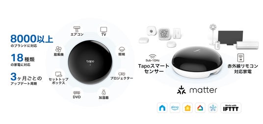 - スマートホーム統一規格「Matter」対応:赤外線リモコン対応家電やTapoスマートセンサーをTapoアプリに追加後、Matterエコシステムに統合させることもできます。*1