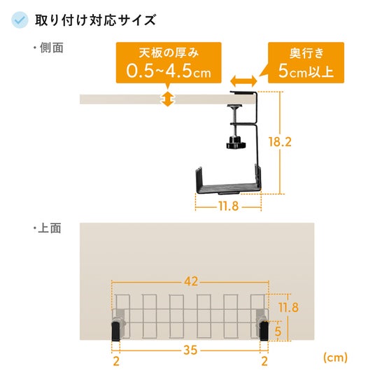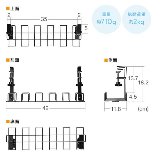 ケーブルトレー 幅42cm クランプ固定 ワイヤータイプ ケーブルオーガナイザー ケーブル収納 小型 配線受け 電源タップ
