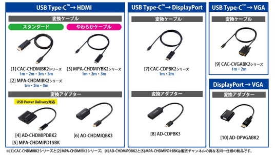 さらにUSB Type-C(USB-C)端子からDisplayPort端子への変換ケーブルおよび変換アダプターをはじめ、USB Type-C(USB-C)端子からVGA端子への変換ケーブル、DisplayPort端子からVGA端子への変換アダプターもラインアップしています。