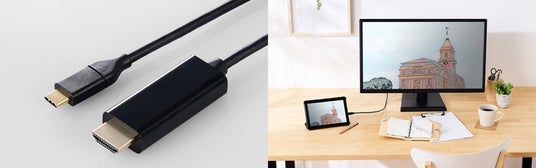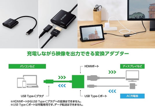USB Type-C(USB-C)ポート搭載のスマートフォン/タブレット/パソコンの映像・音声信号を、HDMI端子に変換して出力できる変換ケーブルおよび変換アダプターです(※1)。