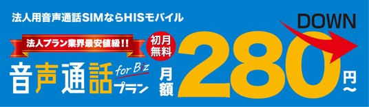 H.I.S. Mobile株式会社(本社:東京都港区 代表取締役社長:猪腰英知 以下、HISモバイル)は、法人のお客様向けSIMサービスの新料金プランを本日より提供を開始いたします。本サービスは、お客様のご利用状況に合わせて音声対応、データ定額、データ従量と3種類のプランご用意させていただいております。音声対応の「音声通話プラン for Biz」は月額280円~ご利用いただけ、20GB・30GBプランには6分かけ放題付きとなっております。