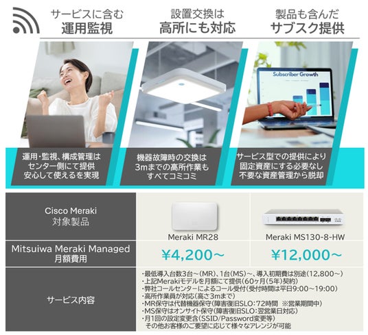 ミツイワ株式会社(本社:東京都渋谷区、代表取締役社長 高橋 洋喜、以下:ミツイワ)は、無線LAN環境の機器調達から導入設計、構築、運用、保守までの全てを含んだサブスク型のマネージドサービス「Mitsuiwa Meraki(R) Managed」を、シスコシステムズ合同会社(以下:シスコ)のクラウド管理型ITインフラソリューション「Cisco Meraki(R)」を使って構築し、本日より提供を開始しました。