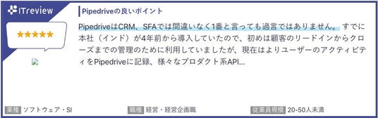 「Pipedrive」は、ITreviewで平均★4.5(2024年10月18日時点)という高評価を獲得し、実際のユーザーからも「営業プロセスの効率化が劇的に進んだ」「使いやすいUIで、誰でも簡単に操作できる」などの声をいただいています。当製品のご利用者様から実際に寄せられたレビューを一部ご紹介します。
