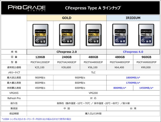 ProGrade Digital Incorporatedは、CFexpress 2.0 Type A GOLDシリーズに最小容量の120GBを追加し、本日Amazon.co.jpで販売開始しました。税込価格は「世界共通価格」の25,100円です。