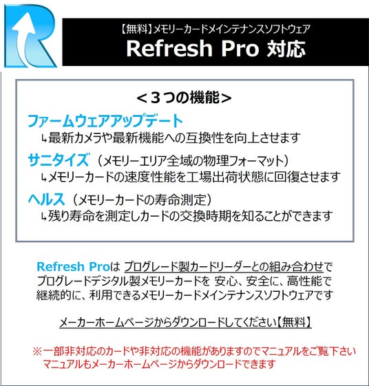 ProGrade Digital CFexpress Type A/SDダブルスロットカードリーダーPG09との組み合わせで、メモリーカードの寿命診断(ヘルス)、メモリーリフレッシュによる速度性能の回復(サニタイズ)、ファームウェアアップデートができる「Refresh Pro(無料)」に対応しています。