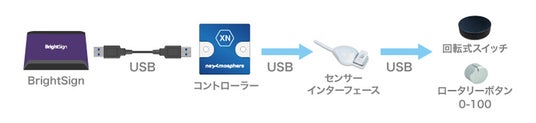 「回転式センサー」とサイネージプレーヤー「BrightSign」の接続図