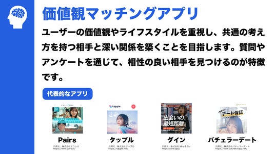 ユーザーの価値観やライフスタイルを重視し、共通の考え方を持つ相手と深い関係を築くことを目指します。質問やアンケートを通じて、相性の良い相手を見つけるのが特徴です。