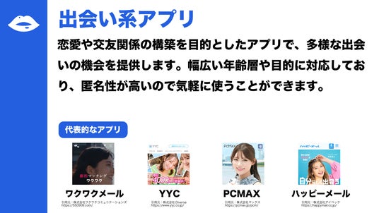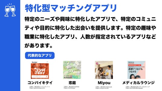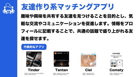 当社は本データベースの無償提供を通じて、より多くのユーザーがマッチングアプリを利用して出会いを楽しむ機会を提供し、業界全体の発展に貢献していきます。