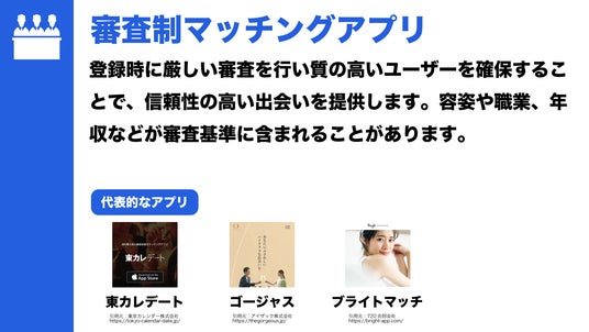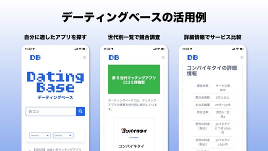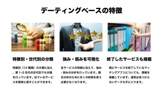 「デーティングベース」は、マッチングアプリのユーザーやアプリ開発事業者、メディアなどに向けて、アプリ情報を網羅した高品質なデータベースです。