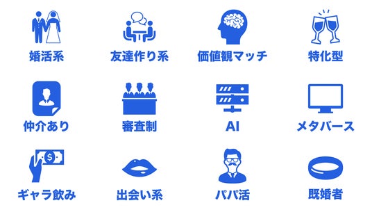 「デーティングベース」では、マッチングアプリを目的別に12種類に分類して掲載しています。