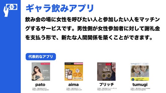 飲み会の場に女性を呼びたい人と参加したい人をマッチングするアプリです。男性側が女性参加者に対して謝礼金を支払う形で、新たな人間関係を築くことができます。