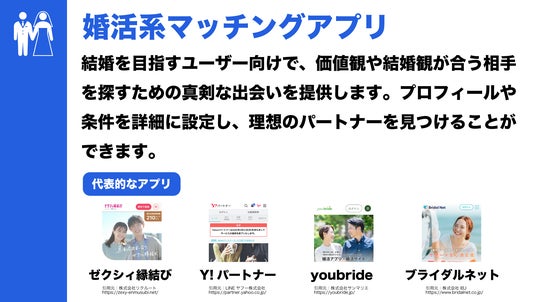 代表的なアプリには、「Yahoo!パートナー」「ゼクシィ縁結び」「youbridge(ユーブライド)」「ブライダルネット」などがあります。