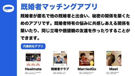 代表的なアプリには、「Healmate(ヒールメイト)」「既婚者クラブ」「MarriedGo(マリーゴー)」「Meet(ミート)」などがあります。