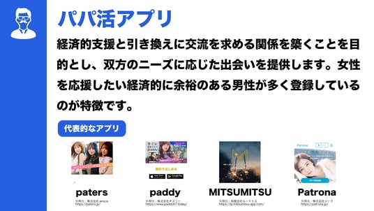 代表的なアプリには、「paters(ペイターズ)」「paddy(パディ)」「MITSUMITSU(ミツミツ)」「Patrona(パトローナ)」などがあります。