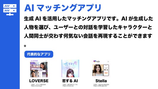 代表的なアプリには、「LOVERSE(ラヴァース)」「恋するAI」「Stella | AIとの禁断の恋」などがあります。