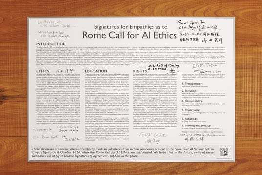 生成AIの発展は、どんな状況になっていくのか予想がつかず、また急速な変化をもたらすものと思われます。規制は間に合いませんし、そもそも利用者の利用の仕方の規制は困難です。AIに関するガバナンスは一人一人の倫理観、企業それぞれの行動指針に委ねられている部分が大きいと考えます。この観点から全世界的な普遍性をもつRome Call for AI Ethicsは極めて重要だと考えます。10月8日の共感署名式は第一歩です。今後、弊社も率先して、AIガバナンスについて行動してまいりたいと考えます。