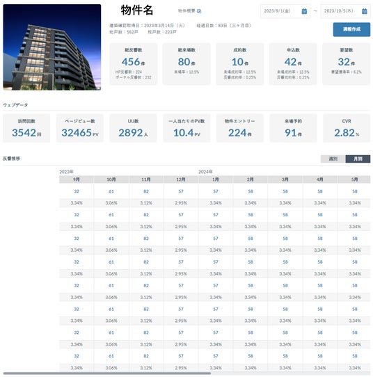 資料請求日時・来場日時やステータス、反響媒体の内訳などがひとつの画面上でリアルタイムにグラフ化されるため、必要な情報を一目で直感的に把握することが可能です。