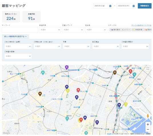 エントリーや来場予約のあった顧客が地図上にマッピングされ、可視化することができます。これにより、ターゲット層がより多く存在するエリアが視覚的に分かりやすくなり、効果的なターゲットリーチが可能となります。