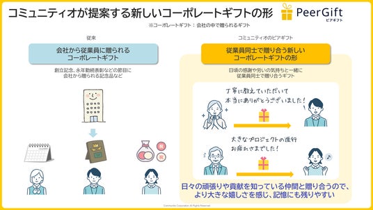従来のコーポレートギフト(会社の中で贈られるギフト)は、創立記念日や永年勤続表彰などの節目に会社から従業員に記念品が贈られていましたが、コーポレートギフトの新しい形として、従業員同士で気軽にデジタルギフトを贈り合える「ピアギフト機能」をコミュニティオは提案しています。