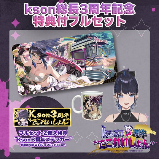 今までのLive3Dコンサートスタイルとは違うデコトラスタイルで行われ、豪華スペシャルゲストも登場しました。3周年記念グッズでは、配信でKsonが乗っていたデコトラがデザインされたデスクマットなどが販売されました。