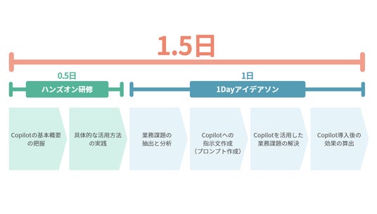 元マイクロソフト社員をはじめとしたプロフェッショナルが伴走し、1.5日という短期間でCopilot導入の利点を明らかにすることで、多くの人員や時間を割くことなく導入の検証を行うことができます。