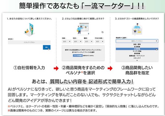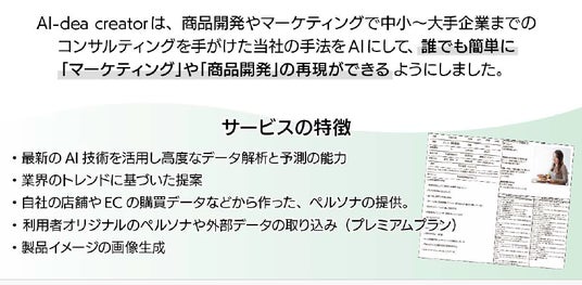 AI-dea Creatorでは、これまでの当社の購買データやAIカメラのデータおよびアンケートデータなどから購買の特徴によりマーケティングのターゲット設定に必要な「ペルソナ」を統計的に集計して作り上げ、これまでのコンサル実績などのデータベースなどから、AIがペルソナにデプスインタビューをするような形で商品のアイデアやプロモーション方法を提供するシステムです。