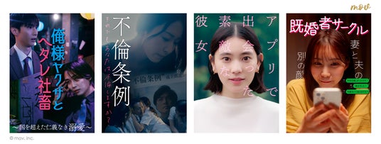 『俺様ヤクザとヘタレ社畜~国を超えた仁義なき溺愛~』、『不倫条例 それでも、あなたは不倫しますか?』、『アプリで出会った素敵な彼女』、『既婚者サークル 妻と夫の別の顔』の4作品は、いずれもデジタルコミック(出版社:株式会社CLLENN)で人気の漫画を原作とした作品となっており、初の映像化となっています。この度、各作品の豪華キャストの出演が決定し、キービジュアルも初公開いたします。