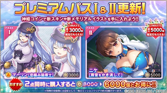 『神姫PROJECT』にて、ヱレミア、ステュクスが新たな神姫として初登場!さらに毎日最高100連のルーレットガチャの開催やプレミアムパスの特典が更新!