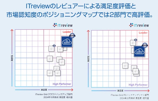 満足度評価と市場の認知度のポジショニングマップではクラウドバックアップ、PCバックアップの2部門で高評価。