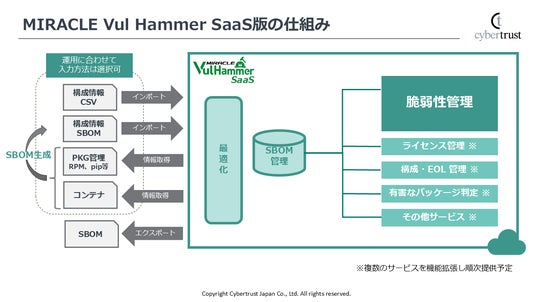 サイバートラスト株式会社(本社:東京都港区、代表取締役社長:北村 裕司 以下、サイバートラスト)は、サーバーやネットワーク機器に内在する脆弱性の可視化と対応を自動化する脆弱性管理ツール「MIRACLE Vul Hammer(ミラクル バル ハンマー)」の最新版を2024年10月29日より提供開始します。このたびの最新版はSaaSとして提供し、SBOMのインポート機能の強化により、複数のソフトウェアで構成されるシステムにおいて複数のベンダーから提供される異なる形式のSBOMを統合管理可能にします。SBOMを用いた効率的な脆弱性管理の導入をより容易に実現することにより、ソフトウェアサプライチェーンセキュリティ対策とシステム運用コストの削減を支援します。