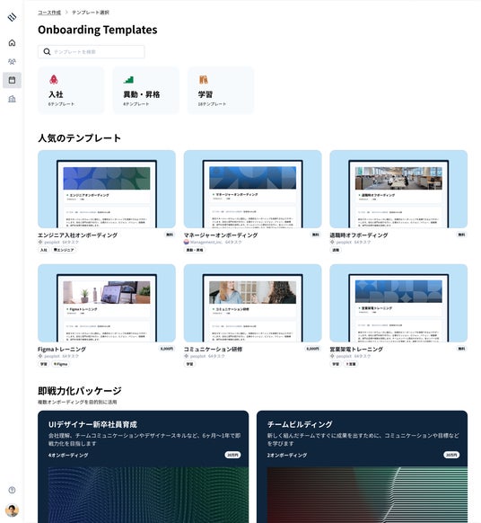 PeopleWork公式の無料テンプレートや、サードパーティの有料テンプレートをプリセットで提供予定です。PeopleXのオンボーディングナレッジ(※)をプロダクト上に開放することで、ラーニングやオンボーディングのベストプラクティスをもとに、コース設定が可能になります。