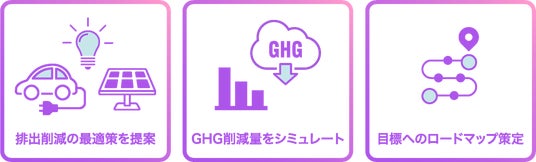 温室効果ガス排出量の計測・可視化だけでなく、排出削減目標を達成するための具体的なアクションをご提案するサービスです。基準年度、目標達成年度、削減目標、設備データなどの必要なデータを入力すると、事業所設備の「電化」「効率化」、使用電力の「再エネ化」、削減しきれない排出の「カーボン・オフセット」の中から、最適化アルゴリズムにより最も効果的な組み合わせを自動でご提案します。