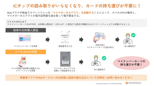 ポケットサイン株式会社(本社:東京都中央区、代表取締役CEO/COO:梅本滉嗣、以下当社)は、当社が開発・提供しているデジタル身分証アプリ「ポケットサイン」が、マイナンバーカードを使わずにスマートフォンのみで公的個人認証サービス(JPKI)*を利用できる「スマホJPKI」への対応を完了したことをお知らせします。