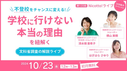 (株)パステルコミュニケーション(本社:東京都豊島区、代表取締役:吉野加容子)が運営する、発達障害・グレーゾーンの子どもを育てるママがいつでも学べて相談できる月額制会員サイトNicotto!塾は、10月23日(水)12時から「\不登校をチャンスに変える!/学校に行けない本当の理由を紐解く~文科省調査の解説ライブ~」オンラインライブを開催いたします。https://desc-lab.com/nicotto2022/?prt1018