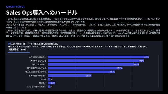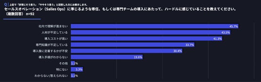 Sales Ops の導入にあたっては、複数のハードルも存在することが明らかになりました。最も多く挙げられたのは「社内での理解が進まない」(45.7%)という点で、Sales Ops の概念や効果に関する組織内の認知度向上が課題となっています。