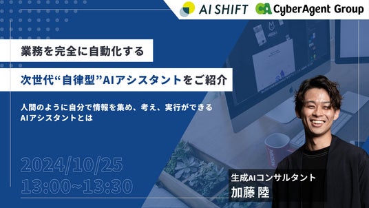 株式会社サイバーエージェント(本社:東京都渋谷区、代表取締役:藤田晋、東証プライム市場:証券コード4751)の100%子会社で、生成AIを活用した業務改革を総合的に支援する株式会社AI Shift(本社:東京都渋谷区、代表取締役社長:米山結人)は、次世代AIアシスタントに関するオンラインセミナーを開催いたします。