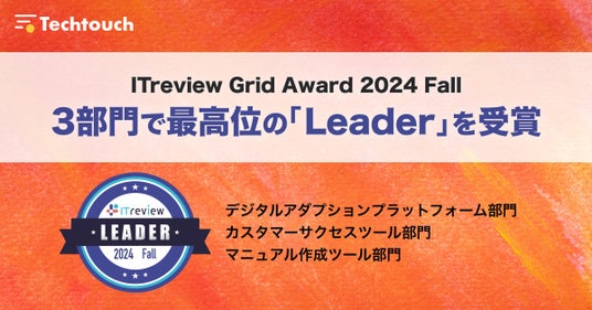 テックタッチ株式会社(本社:東京都港区、代表取締役 CEO:井無田仲、以下 当社)が提供・開発する、デジタルアダプションプラットフォーム(DAP)国内シェア3年連続No.1の「テックタッチ」が、IT製品レビュープラットフォーム「ITreview」で発表された「ITreview Grid Award 2024 Fall」において、3部門で最高位である「Leader」を受賞したことをお知らせします。