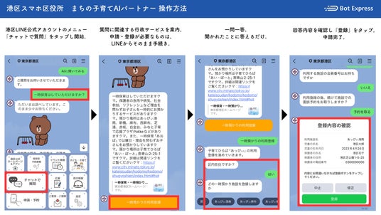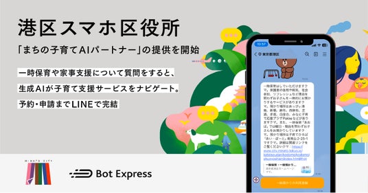 港区(区長:清家 愛)と株式会社Bot Express(本社:東京都港区、代表取締役:中嶋 一樹、以下 Bot Express)は、本日、港区LINE公式アカウント上に開設している港区スマホ区役所において、生成AIを用いた子育て並走サービスを開始することをお知らせいたします。区民が子育て支援を受けたい時、港区LINE公式アカウントに相談をなげかけると、生成AIが子育て支援サービスを案内します。さらに、一時保育や家事支援については、支援を受けるために必要な予約や申請などの手続きを、LINEのトーク画面でそのまま完結することが可能です。